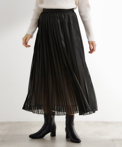 光沢と軽やかさをまとう上品プリーツスカート【デザイン】ひらりと揺れる、シアー×チンツ加工のプリーツスカート。やや光沢のある素材と透け感のある素材が交互に織り込まれた生地で、歩くたびにさりげない華やかさを演出します。裏地には配色を効かせ、見えない部分にもさりげない遊び心を。ウエストは後ろゴムでラクな穿き心地ながら、脇にファスナーをつけて着脱もスムーズに仕上げました。【素材】程よいハリ感と柔らかさを兼ね備えた、軽やかな素材感。チンツ加工による上品な光沢と、シアーの透け感が絶妙にミックスされ大人っぽくも抜け感のある印象に。ブラック・オリーブ・ベージュの3色展開で、ベーシックながらこなれた印象に仕上がります。【スタイリング】ふんわり広がる裾に、ニットやカットソーをアウトで合わせる今年らしいバランスがおすすめ。足元はローファーやショートブーツで品よくまとめても、スニーカーでカジュアルダウンしても◎。きれいめにもリラクシーにも着回せる、大人の毎日に寄り添う1枚です。【仕様】・ポケットなし・左脇ファスナー・ウエスト後ろゴム・裏地あり※こちらの商品はやや透け感があります。※照明の関係により、実際よりも色味が違って見える場合があります。また、パソコン・スマートフォンなどの環境により、若干製品と画像のカラーが異なる場合もございます。【25AW】モデル情報:身長166cm B80 W59 H86 着用サイズ:02(M)店舗へのお問い合わせ商品番号:768-74008●製品寸法:01(S):W66cm H98cm 総丈86cm02(M):W69cm H100cm 総丈88cm03(L):W72cm H103cm 総丈90cm04(LL):W75cm H105cm 総丈92cm05(3L):W78cm H108cm 総丈92cm備考: