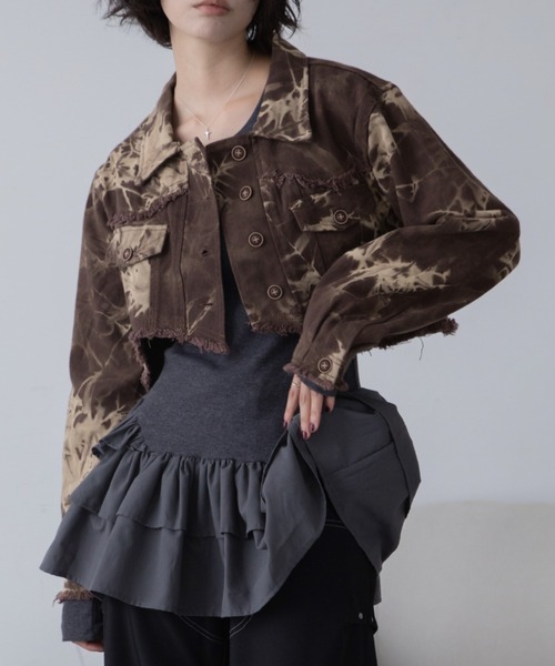 - 2025 VACANCY FALL/WINTER COLLECTION - ニュアンス柄が存在感を放つショート丈デニムジャケット ◆FABRIC タイダイ調が珍しい!デニムジャケット。 裾にフリンジ加工とウェーブデザインがこなれた感を演出。 短めの丈感はスタイルアップに繋がり、 ワイドパンツやハイウエストボトムスワンピースとの相性抜群◎ 程よい厚みのあるコットンデニム素材を使用し、 しっかりとした生地感をありながら柔らかさもあり、着心地が良いのが特徴。 タイダイ調の染め加工で、1点ごとに風合いが異なるもの魅力です。 ◆STYLE カジュアルはもちろん、 レースやシアーアイテムをレイヤードしてモードに仕上げるのもオススメ! 羽織るだけでコーディネートにエッジを効かせてくれる主役級アイテムです。 ・・・・・・・・・・・・・・・・・・・・ 透け感:なし 裏地:なし 伸縮性:なし 光沢感:なし 生地の厚さ:普通 ・・・・・・・・・・・・・・・・・・・・ 【お買い物をお楽しみいただく為に】 ▼お気に入り登録をオススメ致します▼ ♡をクリックして下さい。 ・《商品のお気に入り登録》で再入荷通知や、ラスト1点の通知、セールの際の通知も受け取ることができます。 ・《ブランドのお気に入り登録》で新作商品や再入荷など、お得な情報を受け取ることができます! 【ATTENTION】 ※画像の商品はサンプルです。 実際の商品と色味、仕様、加工、サイズ、素材等が若干異なる場合がございます。 ※撮影場所やお使いのモニター環境により若干お色味が異なる場合がございます。 ※製品によっては染料の特性上、湿った状態や汗をかいた状態での長時間の放置、または摩擦により、他のものへ色移りする恐れがありますので、着用時にはご注意下さい。 ※お洗濯については商品の洗濯タグ表記をご確認ください。 ※風通しがよく、湿気の少ない日の当たらない場所で保管して下さい。 ※また製品加工上、お手元に届く際に匂いが生じる場合がありますが、 ご使用を続けていく事により匂いは軽減されます。
