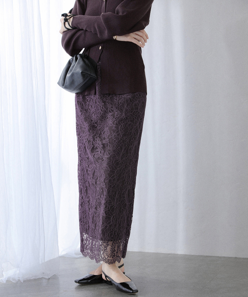 【2025AW】La Totalite《WEB限定》大人気のレースタイトスカートがマキシ丈のAW仕様になって登場!繊細なラッセルレースの美しさはそのままに、ストンと落ちるタイトなシルエットが縦ラインを強調してスタイルアップ効果も◎ウエストは総ゴム仕様で、きちんと感がありながらもストレスフリーな着心地を実現。動くたびに揺れる繊細なレースが、大人の女性らしさを引き立ててくれます。ベーシックなトップスと合わせるだけで華やかさのある着こなしに。通勤からお出かけ、オケージョンシーンまで幅広く活躍します。**********************透け感:なし裏地:あり伸縮性:なし光沢感:なし生地の厚さ:普通**********************【スタッフ着用コメント】《スタッフ名:mizuki》身長:160cm/体型:普通/普段サイズ:S~M/着用サイズ:38サイズ感:38サイズで裏地の丈が足首の上にかかるくらい。ウエストは窮屈感なく、ジャストでした。素材感:甘すぎない上品な柄。オールシーズン着用可能な素材感。着心地:ウエスト総ゴムで楽な履き心地。バックスリット入りで、マキシ丈でも脚裁き◎**********************※取り扱いについては、商品についている品質表示でご確認ください。※照明の関係により、実際よりも色味が違って見える場合があります。またパソコン・スマートフォンなどの環境により、若干製品と画像のカラーが異なる場合もございます。※商品の色味は、商品アップ画像をご参照ください。着用モデル身長:164cm 着用サイズ:38本体:ドライクリーニング