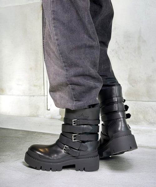 【ASH公式ショップ】 2025年 Autumn&Winter COLLECTION ベルトデザインのコンバットショートブーツ。 ボリューミーな厚底に大きめのソール、さらに筒回りに複数のベルトデザインを施し、ロックかつメンズライクな雰囲気へと仕上がりました。 また、つま先とかかとのコバにゴム素材のスタッズデザイン、筒のサイドに星モチーフの刺繡、さらに履き口にプルストラップのデザインを施すなどディテールにこだわったASHらしいエッジさが光るアイテムに。 アッパーからソール、ベルトデザインまでオールブラックに仕上げたクールさと、 艶感のある上質なレザーがいつものコーデをワンランク上にアップデートしてくれそう。 厚みのあるボリュームソールはトレンドライクなデザイン性だけでなく、緩やかな傾斜が履き心地とスタイルアップも叶えてくれます◎ オーバーサイズのデニムやカーゴパンツなどに合わせてとことんストリートスタイルを楽しんだり、アシンメトリーや素材感で遊びのあるスカートやワンピースなどに合わせて、モードなスタイルを完成させるのもおすすめです。 ワードローブに一足は持っておきたいミドル丈の厚底ブーツです。 ■ソール、つま先、かかと部分にはヴィンテージ加工が施されております。 ■天然皮革の為、色むらや軽微な傷等が残っていることがあります。 これらは全て革製品の特性ですので予めご了承下さい。