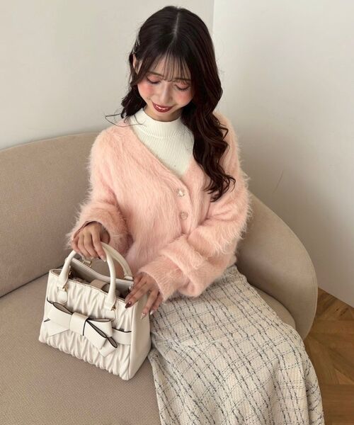 羽織るだけで、女っぽく・あたたかく♪甘さを纏うふわふわカーデ■デザインふわふわの糸を起毛させて、風合いよくやわらかに仕上げたシャギーなショート丈カーディガン。長めの毛足が、女性らしい華やかさと季節感を演出してくれます。ショート丈でバランスが取りやすく、スタイルアップ見えも叶うシルエット。Vネックデザインがデコルテをすっきり見せ、インナー次第で甘さも抜け感も自由自在。ボタンを留めてトップスとしても、羽織りとしても使える万能な1枚です。■サイズ感全体的にゆとりのあるサイズ感。ショート丈なのでスタイルアップ効果も期待できます◎低身長さんや小柄な方もスタイリングのバランスがとりやすい丈です。#低身長#小柄※ネックポイントからの着丈:45.5cm■スタイリングデニムと合わせて、甘すぎない大人のカジュアルスタイルに仕上げるのがおすすめ。スカートと合わせたり、ワンピースの上から羽織れば、ふわっとした素材感がフェミニンさを引き立てて、デートにもぴったりです。タートルネックのインナーをレイヤードすれば、暖かさもありつつ旬な着こなしに。足元はショートブーツを合わせればシーズンムードがさらに高まります。・・・・・・・・・・・・・・・・・・・・・・透け感:なし裏地:なし伸縮性:あり光沢感:なし生地の厚さ:普通・・・・・・・・・・・・・・・・・・・・・・■商品のお気に入り登録 再入荷通知やのこりわずか、お得なプライスダウンの情報も受け取ることができます。ぜひご登録ください◎※サンプルでの撮影の為、製品と仕様が異なる場合がございます。※商品の色味は、撮影場所や光のあたり具合などにより色味が違って見える場合がございます。また、お客様のお使いのモニター環境などにより色味が異なって見える場合がございます。予めご了承の上ご注文下さい。