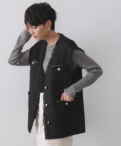 華やかなツイード生地と、ボタン使いが目を引くベスト【デザイン】・華やかなツイード生地を活かした、Vネックベスト。・袖口や前立てにあしらったフリンジテープや、シルバーのボタン使い、ポケット上縁の合皮使いなど、かしこまりすぎない印象の一着に仕上げています。・やや長めのミドル丈で、ヒップやお腹周りの体型カバーもかないます。・フロントのボタンはあけても、閉めてもさまになるデザインです。・ブラウスやタートルニットなどを合わせたきれいめスタイルはもちろん、Tシャツやカットソーインナーを合わせたカジュアルな着こなしもおすすめです。【素材】・表面感のある華やかなツイード素材を使用・マシンウォッシャブルでお手入れも簡単です。【仕様】・ポケット数:胸元×2 前×2・裏地あり※照明の関係により、実際よりも色味が違って見える場合があります。また、パソコン・スマートフォンなどの環境により、若干製品と画像のカラーが異なる場合もございます。モデル情報:身長163cm B82 W62 H91 着用サイズ:38(M)店舗へのお問い合わせ商品番号:637-44017●製品寸法:36(S):着丈64cm B96cm 肩幅43cm38(M):着丈65cm B98cm 肩幅43cm40(L):着丈66cm B101cm 肩幅44cm42(LL):着丈68cm B104cm 肩幅44cm備考:重量:38(M)約545g