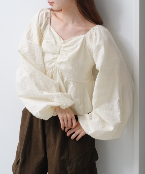 ふんわりとしたボリューム袖が魅力のバルーンブラウス■デザイン袖ボリュームが目を惹き、胸元には細やかなギャザーを寄せ、立体感のあるデザインに。ウエスト切り替えから広がるペプラムシルエットが、さりげなくスタイルアップを叶えてくれます。■生地感柔らかい生地なので、落ち感があります。カジュアル派さんにも着やすい一枚。■コーディネートデニムやスラックス、カーゴパンツと合わせてカジュアルに。スカートやショートパンツと合わせてフェミニンにと、幅広いコーディネートで活躍する万能アイテム。主役級の存在感を放ちながらも、日常に取り入れやすい一枚です。■素材・洗濯表示素材:(表地)綿100%,(裏地)綿100%洗濯:手洗いまたは洗濯ネットに入れ洗濯機の手洗いコースで洗濯可能タンブル乾燥:不可アイロン:120℃まで※サイズ採寸は各モールによって異なり、多少の誤差が生じる可能性がありますのでご了承ください。※撮影画像はサンプル品を使用しているため、実際の商品とカラー、仕様、加工、サイズが若干異なる場合がございます。使用しているパソコンのモニター設定や、携帯電話のメーカー・機種により実際のカラーと異なって見える場合がございます。予めご了承ください。▼商品のお気に入り登録ハートマークをクリックし、お好きなカラーを選んでお気に入りに登録完売カラーの再入荷通知や、ラスト1点の通知、セールの通知も受け取ることができます。▼ブランドのお気に入り登録新商品や再入荷等、いち早くブランドのお得な情報を受け取ることができます。<返品・キャンセルについて>・着用・洗濯後の返品・ご交換は致しかねます。・商品到着後、着用前に商品を確認して頂きますようお願い致します。