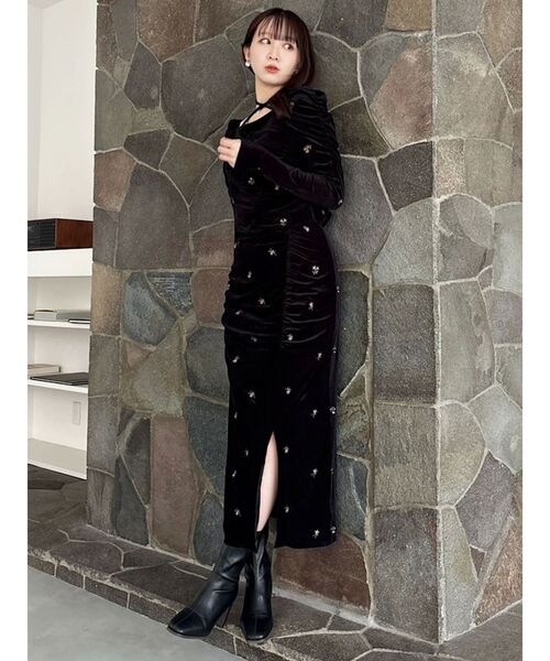 【商品】上品な艶と落ち感のあるベロア素材に、繊細な小花刺繍を施したロングスカート。サイドに施されたギャザーディテールが動きに合わせて柔らかく揺れ、女性らしいニュアンスを引き立てます。ほどよいフィット感がありながら、ウエストゴムでリラックス感のある穿き心地も魅力。スリット入りの裾がさりげない抜け感を演出し、甘さと色気を兼ね備えた一枚に仕上がっています。【スタイリング】同素材のトップスとセットで着用すれば、ワンピースライクな華やかコーデに。ざっくりニットやシンプルなシャツと合わせても、スカートの刺繍が引き立ちます。足元はローファーやブーツで季節感をプラスしつつ、トップスをインしてウエストマークするとバランスよくまとまります。