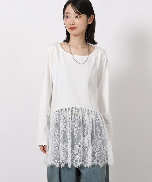 ボディがカットソー、裾が異素材デザインになったトップス。 ニットやスウェットと合わせれば簡単にレイヤードスタイルが楽しめる1枚です。 裾のデザインはレースと布帛の2種類でご用意。 色違いでもおすすめのアイテムです。 【素材】 カットソーは柔らかな綿100%素材。 繊細なレースとシンプルな布帛の切替デザイン。 【スタイリング】 ニットやスウェットとのスタイリングがおすすめ。 ジャストのサイズ感なので重ね着もしやすく、長袖でシーズン長くお使いいただけます。