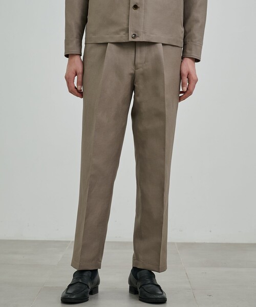 <素材> ・透け感 なし <デザイン> 素材の力を最大限に引き出す為にディティールを削ぎ落とし、ミニマムに纏め上げた1タックスラックス。 1タック入れる事で腰回りとヒップに程よくゆとりを持たせ、細過ぎず太過ぎず絶妙なバランスで設計されたスリムストレートシルエットが特徴。 肌当たりを考慮した前裏仕様とバックシャーリング+ドローコードのイージー仕様でストレス無く快適に着用していただけます。 <生地> 超低速レピア織機でゆっくりと空気を含ませながら高密度に織り上げたウールリネンツイル。 国内外の錚々たるブランドのファブリックを手掛ける山栄毛織株式会社にて生産。 タテにメリノウール、ヨコにはヨーロッパリネンを使用。 BLACKはタテ黒、ヨコはダークブラウン、GREIGEは同色のトーン×トーン。 色味に奥行きを感じられるよう両色タテヨコの糸染めから徹底的に別注した繊細なシャンブレーカラーで構成。 ウール100%では表現できない質感と風合いを上質なリネンをブレンドすることで実現したハイブリッド素材。紳士地が得意な尾州で全工程一貫して行っており天然繊維特有のナチュラル感を一切感じさせない、切れ味抜群の自信作です。