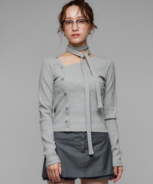 アシンメトリーリブニット 【ポイント】 首元のアシンメトリーデザインが程よい遊び心を添えながら、洗練された大人の上品さを引き立てます。シンプルなスタイリングに合わせるだけで、モード感あふれるアクセントに。 【デザイン・シルエット】 身体に程よくフィットするシルエットに、リブ仕様が縦のラインを強調し細見えを実現。さらに長めに設計された袖丈が、よりスタイリッシュなバランスを演出します。ショルダー部分から裾へと続くデザインボタンの切り替えが、立体感をプラスし、野暮ったさを感じさせないシャープな印象に。付属のリボンで首元に華やかさをプラスします。 【おすすめのスタイリング】 フレアパンツやチュールスカートでできれいめに、デニム合わせでカジュアルにも。ミニボトムスとも相性が良く、カジュアルからフェミニンまでどんなトップスにもマッチする一枚。 【素材】 コットンならではの柔らかな肌触りと通気性に、ストレッチ性をプラスすることで、快適さとしわになりにくく美しいシルエットを両立しています。 ※ご覧のモニター環境や撮影環境により実際の商品と多少色味が異なって見える場合がございます、ご理解の程を宜しくお願い致します。 ▼商品のお気に入り登録をおススメ致します☆サイズやカラー横のハートマークをクリック! 完売カラーの再入荷や、ラスト1点の通知、セールの際の通知を受ける事ができます。 お気に入り登録も宜しくお願い致します♪