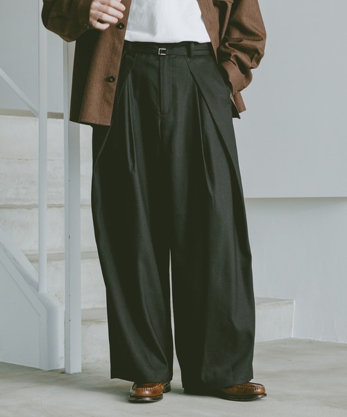 極上のワイドシルエット。同素材のベルト付きで上品な雰囲気に。ーーー■ポイント同地のベルトが付属した、デザイン性の高いスラックスです。フロントに深めのタックが入っており、腰回りにゆとりを持たせた立体的なシルエットに仕上がっています。適度なワイドシルエットで、合わせるスタイルを選ばず幅広い着こなしに対応可能な1本。RAGEBLUEの新たな定番となり得るワイドスラックス、是非お試しください。■素材テトロン(ポリエステル)とレーヨンを混紡したTR生地を使用。ポリエステルの「耐久性」と「速乾性」、レーヨンの「柔らかさ」と「ドレープ性」といった各素材の特徴を兼ね備えています。オールシーズン通して使える厚みの生地で長い期間でご着用いただけます。======■参考サイズM:~175cmL:175cm~======ーーー
