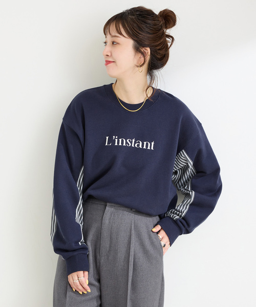 袖下をストライプのシャツ地で切り替えた遊び心のある裏毛スウェット。程よく肉感のある裏毛素材をベースに、異素材コンビがコーディネートに軽さと抜け感をプラスし、定番スウェットをぐっと新鮮な印象に見せてくれます。胸元にはシンプルなロゴプリントをあしらい、デニムやワイドパンツはもちろん、スカートとのミックススタイルにも好相性で、デイリーに活躍する一枚です。ネットに入れ、洗濯機洗い(弱)可能で気軽にお手入れできるのも嬉しいポイント。**********************透け感:ホワイトのみややあり裏地:なし伸縮性:ややあり光沢感:なし生地の厚さ:普通**********************【スタッフ着用コメント】《スタッフ staff.Y》身長:160cm/普段サイズ:M-L/着用サイズ:フリーサイズ感:身幅・着丈ともにゆったりめ、袖回りもゆったりしてます。素材感:柔らかなスウェット素材、ドッキング部分はややハリのある素材です。着心地:厚すぎず薄すぎない生地感。やや前後差のある着丈で、ボトムスとのバランスも取りやすいです。※あくまで個人の感想です。**********************※取り扱いについては、商品についている品質表示でご確認ください。・着用中の摩擦や、汗、水濡れにご注意ください。濡れたままの状態で擦れると、色移りすることがあります。・形を整えて干してください。洗濯により収縮やねじれ。型崩れすることがあります。・水洗いで多少縮みます。※ホワイト(010)カラーについて・蛍光増白剤配合洗剤は使用しないでください。※カーキ(036)、ネイビー(040)カラーについて・日光や蛍光灯の光に弱く、色あせ(変色)しやすい性質があるので、長時間の直射日光は避けてください。※こちらの商品は、B.C STOCKでの取り扱いになります。 直接店舗へお問い合わせの際はB.C STOCK店舗へお願い致します。※照明の関係により、実際よりも色味が違って見える場合があります。またパソコン・スマートフォンなどの環境により、若干製品と画像のカラーが異なる場合もございます。※商品の色味は、商品アップ画像をご参照ください。 ホワイト、カーキ着用スタッフ:157cm 着用サイズ:フリーネイビー着用スタッフ:163cm 着用サイズ:フリー詳細着用モデル:162cm 着用サイズ:フリー本体:洗濯機洗い(弱)
