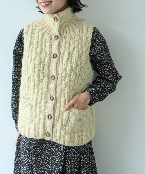 ざっくりと折り返した襟と木のボタンがポイントのベスト。ネパールで職人が一着ずつ丁寧に編み上げた、機械では出せない手作業ならではのぬくもりと風合いが魅力のニットは、スタイリングに取り入れるだけで季節感をぐっと高めてくれます。ボディ部分は太さが異なる凹凸が特徴のスラブ糸をざっくりと編み、ふっくらとした立体的な編地に。襟と前立て、ポケットの細部のディテールは繊維を均一の太さに揃えた編み方で変化をつけ、メリハリのある一枚に仕上げました。外国のおじいさんが着ていそうなどこか懐かしさを感じるベストは、襟を立てて着るとよりメンズライクな印象に。マフラーいらずでしっかりと防寒ができます。ナチュラルな木のボタンで優しい雰囲気。あたたかみを感じるしっかりとしたボリューム感ながらも、重たく見えない絶妙なサイジングです。軽さのあるカットソーやシャツと合わせて本格的な寒さになる前のアウターとしても活躍します。同素材でカーディガン(5001KN001252)もご用意しております。--------------------透け感:なし裏地:なし伸縮性:あり光沢感:なしポケット:あり--------------------【素材の特性・お取り扱いの注意】・取り扱いの注意については取り扱い表示をよくご確認の上、着用をお願い致します。・手編みで編まれている為、サイズ感や風合いが異なります。ふんわりとした風合いのハンドクラフト感をお楽しみ下さい。・デザイン上、引っ掛かりやすいのでアクセサリーやバッグなどの摩擦にはご注意下さい。・(ダークブラウン)素材の特性上、汗や雨などで濡れた時や強く擦られた場合に色落ちし、他の衣料に移染することがあります。特に白いバッグやインナー、ボトムなど摩擦によって色移りしますのでコーディネートには十分ご注意下さい。お洗濯の際はドライクリーニング専門店で単独洗いをして下さい。・天然素材の為、ウール特有のにおいがする場合がございます。※撮影画像は、光の当たり具合やモニターの環境により色味が違って見える場合があります。あらかじめご了承下さい。※お届けする実際の商品と仕様、加工、サイズが若干異なる場合があります。