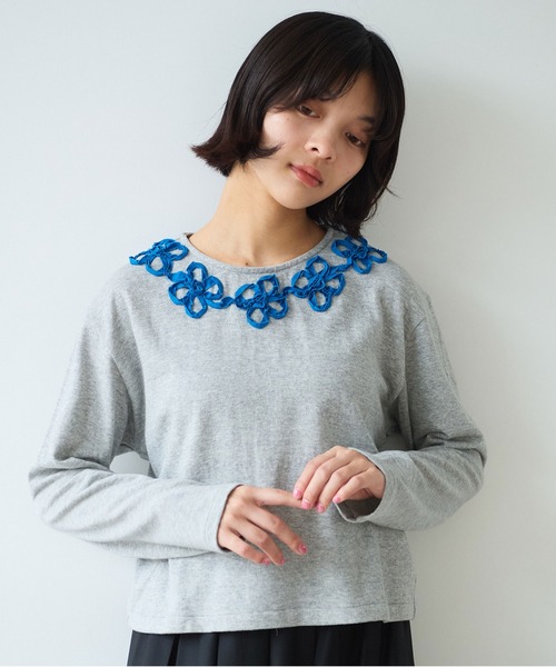 ロンTとスウェットの中間のような程よい肉感の裏毛に、おはなのネックレスをイメージしたテープ刺繍を施しました。あらかじめ肩線や前端を始末してからパネルで刺繍をし、再び縫製するという流れを二つの工場さんをまたいで行っており、手間ひまをかけて仕上げていただいています。ボリューム感のあるボトムとも合わせやすい、すっきりとしたサイズ感に仕上げました。============================透け感:なし裏地:なし伸縮性:なし光沢感:なし============================※素材の特性、お取り扱いの注意水洗い可・・・中性洗剤使用アイロン可・・・あて布使用・この製品はデザイン上、生地を裁ち切り処理をしている為洗濯回数が重なったり、年月が経つにつれ、購入時より糸の抜けやほつれ状態がひどくなりますがこの製品の特徴としてご了承下さい。洗濯の際は、他の物と一緒に洗わない様にして下さい。この製品の特性上、無駄糸が付着することがあります。・この製品に使用しておりますテープ部分は、濡れた状態で長時間放置いたしますと、色落ち、移染する場合がありますので、ご注意ください。・製品洗いの為一点一点サイズ、風合いなどの違いがありますのでご了承下さい。bulle de savon(ビュルデサボン)BRAND CONCEPT女性、誰もが ふっと子供の頃を思い出し 少女のような気持ちに戻れる服。 bulle de savon =シャボン玉の事 石鹸の泡とか、においなど、 懐かしい感じ。設立年月日 1994年8月※グレー、ブラックはサンプルです。実際の商品と仕様・加工・サイズ等が若干異なる場合がございます。※モデルの着用画像は光の関係で商品の色味が若干異なります。※取り扱いの注意については取り扱い表示をよくご確認の上、着用をお願いいたします。※工場の生産の都合上、入荷の時期が前後する場合がございます。ご了承ください。