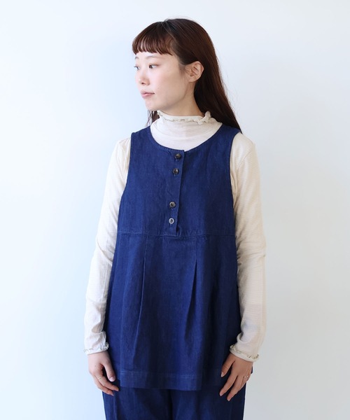 きれいめみえするデニムシリーズ。ベストはチュニックの丈にして、かしこまりすぎず普段使いしやすいデザインにしました。暖かい季節はロンTやブラウスと、寒くなってきたらニットに重ねて。春から秋までロングシーズン着ていただけます。同じ素材のデニムパンツやスカートと合わせてセットアップで着ていただくのもおすすめです。============================透け感:なし裏地:なし伸縮性:なし光沢感:なし============================※素材の特性、お取り扱いの注意水洗い可・・・中性洗剤使用アイロン可・・・あて布使用・この製品は、インディゴ染料にて染めておりますので洗えば洗う程藍染め独特の鮮やかな色と風合が得られます。・特性として着用時(乾摩擦)や汗や雨等でぬれた場合(湿摩擦)色落ちし、他の衣料に色移りする事があります。・他の物に色移りした場合すぐにお洗い下さい。時間がたつと取れにくくなります。・手洗いは必ず単独で洗 濯して下さい。(ドライクリーニングも同様)・綿素材の為、洗濯の際多少縮みますので形を整えてから陰干しで自然乾燥させて下さい。尚、乾燥機の御使用は絶対にお避け下さい。・ドライクリーニングは専門店へお願いします。bulle de savon(ビュルデサボン)BRAND CONCEPT女性、誰もが ふっと子供の頃を思い出し 少女のような気持ちに戻れる服。 bulle de savon =シャボン玉の事 石鹸の泡とか、においなど、 懐かしい感じ。設立年月日 1994年8月※実際の商品と仕様・加工・サイズ等が若干異なる場合がございます。※モデルの着用画像は光の関係で商品の色味が若干異なります。※取り扱いの注意については取り扱い表示をよくご確認の上、着用をお願いいたします。※工場の生産の都合上、入荷の時期が前後する場合がございます。ご了承ください。