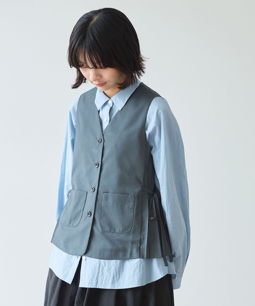 サイドにプリーツの入った、きちっとしたベストを作りました。紐のしぼり加減でシルエットを調節できる仕様に。おめかししたい日にぴったりのベスト。同じシリーズの太プリーツスカートや、ハーフパンツとセットアップでセミオケージョンスタイルに。カジュアルなカットソーと合わせて、デイリー使いも◎============================透け感:なし裏地:あり伸縮性:なし光沢感:あり============================※素材の特性、お取り扱いの注意アイロン可・・・あて布使用・この製品は特殊加工を施していますが永久的なものではありません。着用や洗濯、ドライクリーニングを繰り返しますと徐々に伸びる事がありますが素材の特性として予めご了承下さい。水洗いは絶対に避け石油系ドライクリーニングでお願いします。・(保管方法)たたまずに必ずハンガーに吊して保管して下さい。・(雨に濡れた時)すばやくふきとり元のヒダのように寄せた状態でハンガーに吊して自然乾燥させて下さい。bulle de savon(ビュルデサボン)BRAND CONCEPT女性、誰もが ふっと子供の頃を思い出し 少女のような気持ちに戻れる服。 bulle de savon =シャボン玉の事 石鹸の泡とか、においなど、 懐かしい感じ。設立年月日 1994年8月※グレー、ブラックはサンプルです。実際の商品と仕様・加工・サイズ等が若干異なる場合がございます。※モデルの着用画像は光の関係で商品の色味が若干異なります。※取り扱いの注意については取り扱い表示をよくご確認の上、着用をお願いいたします。※工場の生産の都合上、入荷の時期が前後する場合がございます。ご了承ください。