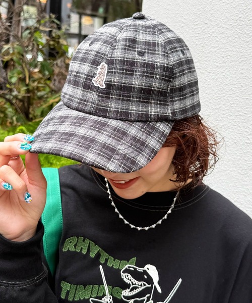 ■デザイン 【ユニセックス着用】 \🦖秋冬コーデの主役CAP🎩✨/ チェック柄にちょこんとミニレックスワッペンがオン♡ ツバはちょいフラットで今っぽシルエット👍 サイズ調整もラクラク◎ ⚫ブラック=クールに🖤 ⚫グレー=カジュアルに🤍 気分で選べる2カラー展開! 🧣スカーフやアクセと合わせて、遊びゴコロ満点のスタイリングを♪