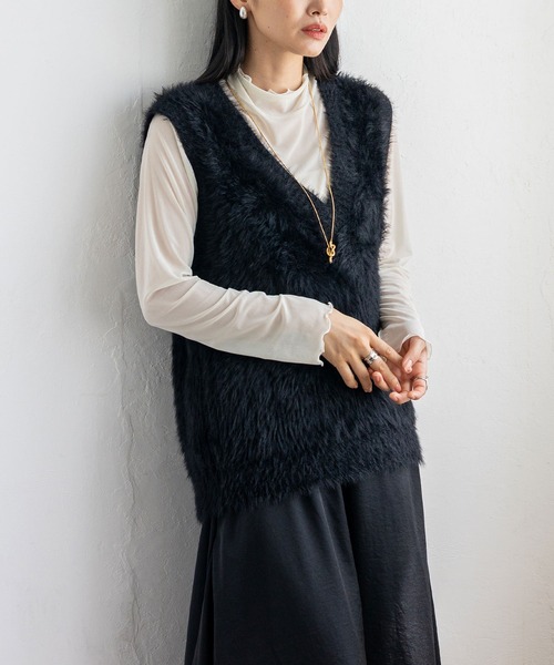 【デザイン】 フェザーヤーン Vネックニットベスト ふんわりとした毛足が魅力のフェザーニットベスト。 エアリーで柔らかな肌ざわりが心地よく、 ふっくらとしたボリューム感が映える1枚です。 深めのVネックデザインが顔まわりをすっきり見せ、 シャツやシアートップスとのレイヤードも楽しめる万能アイテム。 シンプルなデザインで着回し力抜群。 お尻が隠れる丈感で体型カバーも叶います。 秋口はTシャツやブラウスの上から、冬はタートルニットと重ねて。 さらに春先にはワンピースとのスタイリングもおすすめ。 季節をまたいで長く着られるのが嬉しいポイントです。 モード感を出すなら、黒のキャミワンピースやスリットスカートと合わせて、洗練された大人コーデに。 オフィスやきれいめシーンでは、シャツブラウスをインして、スマートカジュアルに。 休日は、デニムやワイドパンツに合わせてリラックス感のある大人カジュアルスタイルに。 スタイリングに取り入れるだけで旬の雰囲気が完成する、ワードローブに欠かせないアイテムです。 【サイズ等】 サイズ:FREE 総丈:62cm 肩幅:45cm 身幅:51cm 重量:340g 素材:ナイロン67% アクリル33% …………………… 伸縮性:あり 裏地:なし 透け感:なし 生地の厚さ:普通 ポケット:なし …………………… 【お取り扱い上の御注意】 ・製品を裏返してネット使用。 ・蛍光増白剤入り洗剤は使用禁止。 ・火気に近付けないで下さい。 ・また、アイロンはお避け下さい。 ・糸、編地の性質上着用の際」髪留めや指輪等の装飾品または爪等に引っかかりやすい為、充分ご注意ください。 ・この素材は直射日光や蛍光灯などの長時間照射により色する場合があります。 ・糸、編地の性質上、洗濯や着用中の摩擦により生地表面にピリングが生じることがあります。ビリングが発生した場合、 引っ張らず小バサミでカットしてください。 ・タンブル乾燥禁止。 ・水や汗で色落ち、移染する恐れがありますので、濡れた状態で放置しないで下さい。 ・また、お洗濯の際は他の物と一緒に洗わないでください。 [カラー] ブラック・グレージュ・アイボリー モデル身長:164cm/着用サイズ:FREE ※撮影環境により実際のカラーとやや異なる場合がございます。 画像をご参照の上、ご了承頂けますようお願い致します。 ◆商品のお気に入り登録◆ 完売カラーの再入荷通知や、ラスト1点の通知、 セールの通知も受け取ることができますので、是非ご登録ください。 ◆ブランドのお気に入り登録◆ 新商品や再入荷などの情報を受け取ることができますので、是非ご登録ください。