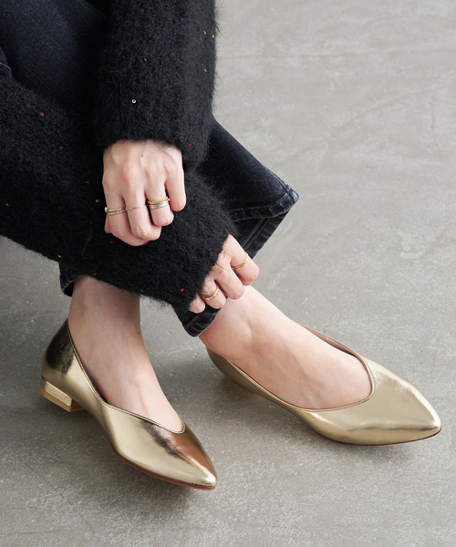 すっきりとしたトウのシルエットがきれいな足元を演出するアーモンドトウフラット。柔らかい素材と、クッション性のあるインソールを使用した歩きやすさが魅力の1足です。パンツでもスカートでもスタイリングを選ばないシンプルなデザインで、ON・OFF兼用で使える万能シューズです。**********************【スタッフ着用コメント】《スタッフS》普段サイズ:23.5/着用サイズ:23.5サイズ感: いつものサイズでぴったり履き心地:素足で履いてジャストサイズでした。柔らかい足当たりで、幅広めの足ですが痛くなることもなかったです。たくさん歩く日にもおすすめな1足!***********************カラーにより素材が異なります。ブラックA 甲材:合成皮革ネイビー・ボルドー 甲材:合成繊維ゴールド 甲材:人工皮革*照明の関係により、実際よりも色味が違って見える場合があります。またパソコン・スマートフォンなどの環境により、若干製品と画像のカラーが異なる場合もございます。*商品の色味は、商品アップ画像をご参照ください。