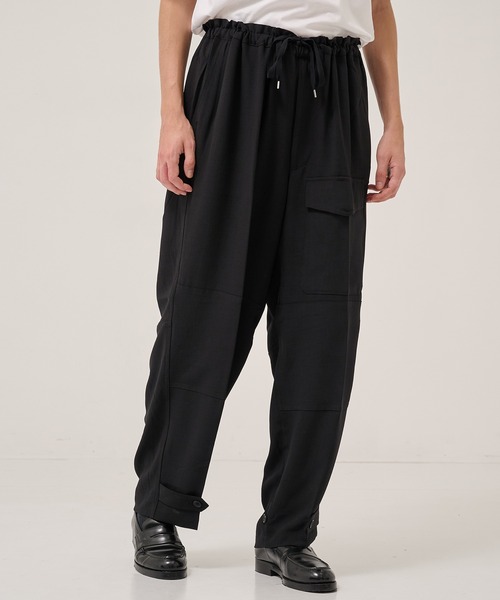 デザイン RAINMAKER定番のMELANGE TWILL DOUGI PANTSをワークデザインにSTUDIOUSで別注。 大胆に大きく設定されたウエストを持つイージーパンツ。 ゴムで絞ることで生まれる腰回りのギャザーと、贅沢に使用した生地が独自のドレープをつくり出し、動きに優雅な印象を与える。 腰紐でウエスト調整可能。 減量が出来ないとされる杢感の出るポリエステルを使用し、糸強度ギリギリをコントロールする設計と染色整理の技術が発揮された素材。 糸が切れるギリギリの高減量を行うことで、とろみとシャリみ、まるでニットのような柔らかな着用感を兼ね備える。 ・素材:POLYESTER 100% ・透け感:なし ・裏地:なし ・伸縮性:なし・手洗い可能 メーカー品番:EX_RM252-044 ブランド:-RAINMAKER- レインメーカー(RAINMAKER)は京都を拠点とするファッションブランド。 2013-14年秋冬シーズンにデビュー。 主にメンズウェアを展開している。 デザイナーの渡部宏一(Koichi Watanabe)はN4(エヌフォー)の立ち上げメンバー。 N4で活躍後、自身のブランド「レインメーカー」を立ち上げる。 2013年秋、京都に旗艦店をオープン。 2018年年春夏コレクションにてウィメンズコレクションがデビュー。 ※店舗と在庫を共有しておりますので、受注確認メールが届いてもご注文のタイミングによりましては売り切れになる可能性がございます。 ※商品の色味につきまして、撮影環境、お客様のお使いのPCのモニター環境により実際のカラーと画像の色味が違って見える場合がございます。