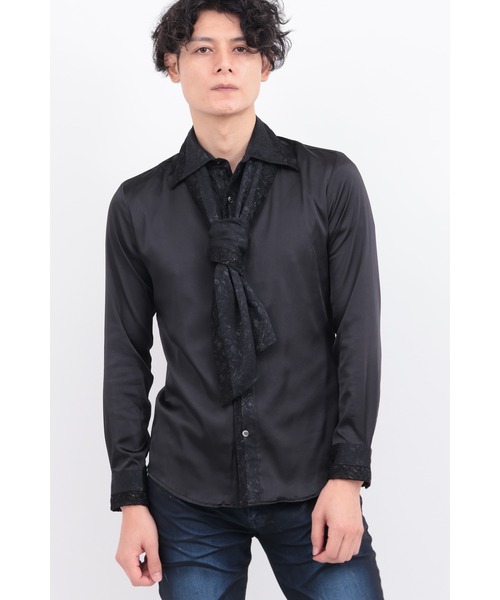 [DESIGN]光沢感が美しいフラワー柄コードレースを、衿まわり・前立て端・カフス先にあしらったストール付きデザインシャツ。やや長めに設計された存在感ある衿型が、ストールなしでも十分にスタイルを引き立ててくれます。付属のストールは軽くひと巻きして、アスコットタイ風にラフに使うのがおすすめ。程よいラグジュアリー感を備えながら、デニムと合わせてカジュアルダウンしたコーディネートも楽しめる、着回し力の高い一枚です。[TEXTILE]本体には、艶やかな光沢と落ち感をもつストレッチロイヤルサテンを使用。衿裏やストールには、バラ柄を織り込んだストレッチローズサテンジャカードを切り替えに採用。さらに、ナイロンレーヨンのなめらかな風合いとラメ糸の豪華な光沢感が特徴の花柄コードレースをトリミングに使用。異素材の組み合わせが奥行きと品格を演出し、洗練された印象を引き立てます。