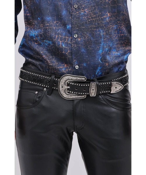 [DESIGN]“ラウンジのGLEAM(きらめき)”をテーマに、センターにラインストーンを敷き詰めたインパクトのあるベルト。 三点バックルにもラインストーンをあしらい、細部まで華やかさを追求。サイドにはメタルスタッズを打ち込み、ラグジュアリー感と無骨なニュアンスを融合させたデザインに仕上げています。[TEXTILE]本体には牛革スムースを使用。センター部分は、ラインストーンを透明樹脂層に半埋め込み状に固定したストーンテープを採用し、優れた密着性と奥行きある輝きを両立。※ラインストーンは、強い衝撃や摩擦、爪などによる引っかきにより脱落する恐れがあります。バッグや金属製品との接触、座面や床との擦れなどにはご注意ください。丁寧にお取り扱いいただくことで、美しい状態を長くお楽しみいただけます。※天然の皮革を使用しているため、摩擦や水濡れにより色落ちすることがあります。雨天でのご使用や淡色の衣類を着用の際は特にご注意下さい。