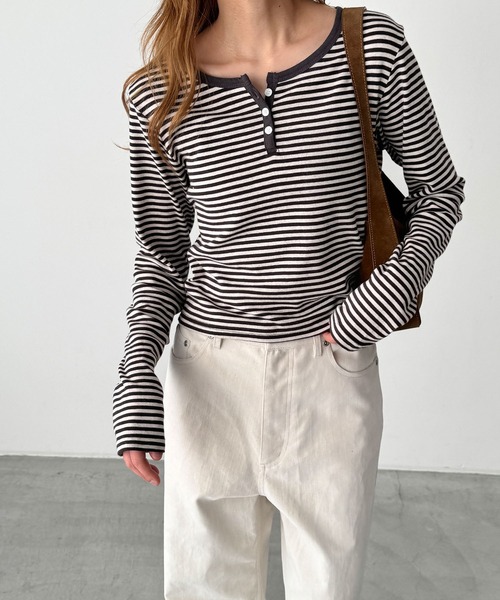 デザイン首元はヘンリーネック仕様で、すっきりとした印象に。女性らしいシルエットを叶えてくれます。素材綿100%で素肌に優しく、ストレスフリーな着心地なのでリラックスして着用していただけます。コーディネートボーダーデザインがコーデのアクセントにぴったり!大人カジュアルにおすすめの1枚です。ボタンでネックの開きを自由に調節できるのも魅力です。-------------------------------------生地の厚さ:厚い〇〇●〇〇薄い伸縮性:あり透け感:なし裏地:なし光沢:なし-------------------------------------取扱い・蛍光増白剤が入っていない洗剤をご使用ください。・クリーニングネットをご使用ください。・濃い色と白 ・淡色物は分けて洗ってください。・洗濯で多少縮むことがあります。洗濯後はすばやく形を整えて干してください。タンブラー乾燥はお避けください。・アイロンの際は当て布をご使用ください。・着用時の汗や摩擦により、他の衣類や鞄などに色移りすることがありますので、淡色系との着合わせはご注意ください。・摩擦や引っかけにご留意ください。※取り扱い及びお手入れ方法については、商品についている取扱表示、洗濯表示にてご確認下さい。※照明の関係により、実際よりも色味が違って見える場合があります。またパソコン・スマートフォンなどの環境により、若干製品と画像のカラーが異なる場合もございます。※商品の色味は、商品アップ画像をご参照ください。
