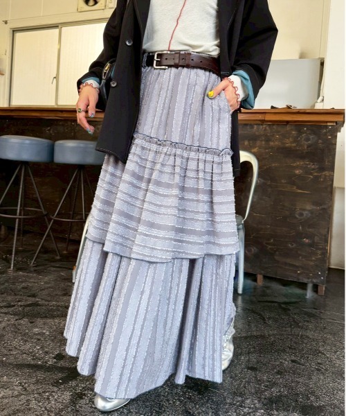 ■デザイン\ストライプ×フリルで差がつく1枚✨/さりげないストライプ生地を使ったティアードスカート💙アシンメトリーなフリルがポイントで、一癖あるデザインが周りと差をつけてくれる主役級アイテム!配色メローが効いていてDOUBLE NAMEらしいカジュアルコーデにも◎同素材のキャミブラウスと合わせれば、ワンピース風に着こなせるのも嬉しいポイント👗💕■ポイント・ダブルネーム・DOUBLE NAME・恐竜・恐竜界隈・ミニレックス・ロングスカート■素材・厚み:薄い・光沢感:なし・伸縮:無し・ウエストゴム:あり※生地寄りの画像が実際の色味と近いものとなります。※ご覧のモニター環境や撮影環境により実際のカラーと異なる場合がございますので画像をご参照の上、ご了承頂けますようお願い致します。