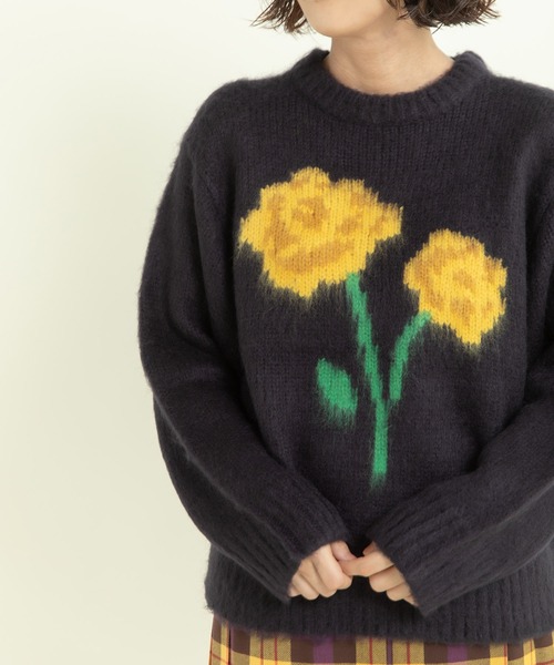 お花のモチーフが印象的なニットプルオーバー。 オリジナル図案のお花はバラをイメージし、柄を編み入れるインターシャの技法を用いることでレトロなバラを表現しました。 シンプルながらも配色で奥行きの感じるキャッチーなモチーフとなっています。 素材はモヘア混の糸を使用することで、柔らかくふんわりとした温かな風合いに。 製品になってから起毛をかけることで、よりふんわりと毛羽立つよう仕上げ、古着のような雰囲気をイメージしました。 形も程よくゆとりのあるサイズ感で、ゆったりとリラックスして着られるニットです。 柔らかくガーリーなアイボリー、よりレトロな雰囲気のサックス、甘過ぎない大人のネイビーとそれぞれ印象が異なる3色展開でのご用意。 レーススカートと合わせてとことんガーリーに、シャツを合わせてトラッドなスタイリングもオススメです。 柔らかな素材なので、真冬は上からアウターも気兼ねなく羽織って頂けます◎ -------------------- 透け感:なし 裏地:なし 伸縮性:あり 光沢感:なし ----------------------- 【素材の特性・お取り扱いの注意】 ・取り扱いの注意については取り扱い表示をよくご確認の上、着用をお願い致します。 ・この製品にはモヘア混の糸を使用し、起毛をかけています。素材の特性上、摩擦により毛抜けや毛玉が発生しやすいです。連続着用を避け、ブラッシングして整えるようお願いします。 毛玉ができた際は無理に引っ張らず、ハサミで取り除いてください。着用時、バックなどの摩擦や引っかかりにはご注意ください。 ・この製品は、素材の特性上汗や雨等でぬれた時、強くこすれた場合等、色落ちし、他の衣料に移染することが有ります。特に白いバッグや白いインナーやボトム等、摩擦によって色移りしますので、コーディネートには十分ご注意ください。お洗濯の際は、ドライクリーニング専門店へお願い致します。 ・この製品は、ニットの性質上、だれ易く、寸法・型などの安定性が乏しいのでハンガー掛けや、平干しはお避け下さい。保管の際は、たたんで保管して下さい。 ※撮影画像は、光の当たり具合やモニターの環境により色味が違って見える場合があります。あらかじめご了承ください。 ※着用の商品はサンプルで撮影しております。お届けする実際の商品と仕様、加工、サイズが若干異なる場合がございます。 model149、model165着用のアイボリーとブルーはサンプルです。サイズ感、お花の大きさ、風合いはネイビーの商品画像が正しいです。ご参照ください。