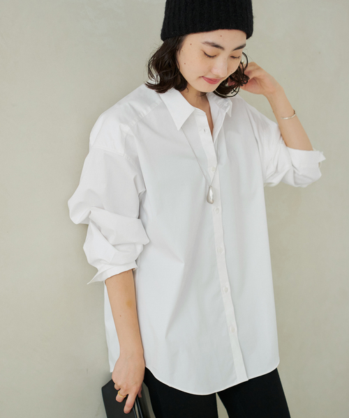 シンプルだからこそ映える、上質なコットンシャツ。程よくストレッチの効いた素材で、快適な着心地と美しいシルエットを両立。ベーシックながらも計算されたサイズ感と長めの着丈が、かっちりしすぎない大人のこなれ感を演出します。ボタンを留めてきちんと感を出したり、袖をまくってラフに着こなしたりと、幅広いスタイリングが楽しめる万能アイテム。カジュアルからオフィススタイルまでシーン問わず着回せて、秋冬のレイヤードにもおすすめの一枚です。**********************透け感:白のみややあり裏地:なし伸縮性:なし光沢感:なし生地の厚さ:普通********************** ※取り扱いについて【サックスブルー(048)】色落ち :着用中の摩擦や汗、水などで濡れたことによる他のものへの色移りにご注意ください。※取り扱いについては、商品についている品質表示でご確認ください。 ※ 店頭及び屋内外での撮影画像は、光の当たり具合で色味が違って見える場合があります。商品の色味は、商品アップ画像をご参照ください。また、お客様のお使いのPCのモニター環境などにより色味が違って見える場合があります。予めご了承の上ご注文ください。ホワイト着用スタッフ身長:162cm 着用サイズ:FREEサックスブルー着用スタッフ身長:156cm 着用サイズ:FREE詳細着用スタッフ身長:162cm 着用サイズ:FREE本体:洗濯機洗い(弱)