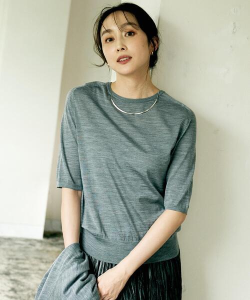 【ウールマーク認証】第三者の認定検査機関を通じて、「ウールマーク」が定めた基準に合格したウール製品にのみ付けられます。 【デザイン】 18Gエクストラハイゲージニット、薄手で洗えるウールシルク素材の六分袖クルーネックプルオーバーです。 クラシックでいてモダンなトレンドの六分袖プルオーバーは、アンサンブルとして同素材のVネックカーディガンと組み合わせることでエレガントなスタイルに。 丸首デザインと六分袖は、さまざまなシーンで着回しでき、一枚でも重ねても便利なアイテム。 上品な肌触りと軽やかな着心地をぜひお楽しみください。 同素材のウールシルクカーディガンの展開有。(商品番号:153-34453) 【素材感】 ウール繊維表面を樹脂で覆って縮みを防ぐ、防縮加工を施した19.5MICのエクストラファインメリノと、シルクをミックスして紡績された細番手の梳毛糸。 発色性が良くシルクの程良い艶感があり、18G編み立ての繊細でクリーンな表面感が特徴の素材。 【着こなしポイント】 同素材のカーディガンとのアンサンブルでの着用がおすすめ。 エレガントなコーディネートを楽しむことができます。 薄手でシンプルなプルオーバーは、Tシャツ感覚でさらっと一枚で。 綺麗めなパンツにベルトを合わせてアクセやサリーや靴でアクセントをつけるシンプルな合わせがおすすめです。 手洗い可なのでデイリーに活躍してくれるアイテムです。 ※照明の関係により、実際よりも色味が違って見える場合があります。また、パソコン・スマートフォンなどの環境により、若干製品と画像のカラーが異なる場合もございます。 モデル情報:身長163cm B80 W59 H82 着用サイズ:02(M) 店舗へのお問い合わせ商品番号:153-14453 ●製品寸法: 00(XS):着丈55cm B92cm 裄丈48cm 02(M):着丈58cm B100cm 裄丈51cm 04(2LT):着丈62cm B106cm 裄丈52cm 44(3L):着丈61cm B107cm 裄丈55cm 48(5L):着丈61cm B122cm 裄丈56cm 備考: