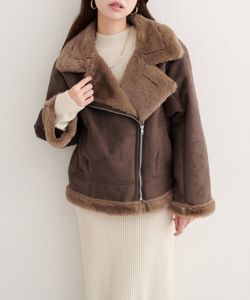 【2025AW natural couture】フェイクファームートンブルゾン■Design 一目見た瞬間から心奪われる、ふわふわのフェイクファーが贅沢にあしらわれたムートンブルゾン。カジュアルな印象のブルゾンを、上品で女性らしい雰囲気に格上げしてくれる、こだわりのディテールが満載です。滑らかなスエードタッチの表面と、ふわふわのフェイクファーの組み合わせが、見た目にも暖かく、そして何よりもお洒落心をくすぐります。襟元と袖口、裾にあしらわれたボリューミーなファーが、お顔周りを華やかに、そしてスタイル全体をバランスよく見せてくれる効果も◎ジップをあえて斜めに作ることで、他には無いデザインなのが魅力のひとつ。フロントジップを閉めて防寒性を高めたり、開けてラフに羽織ったり、様々な着こなしが楽しめます。コンパクトな丈感なので、スタイルアップ効果も期待できます。■StylingデニムやTシャツと合わせてカジュアルに着こなすのはもちろん、ワンピースやスカートと合わせてフェミニンに着こなすのもおすすめです。足元は、ブーツやスニーカーなど、どんなアイテムとも相性抜群。その日の気分やシーンに合わせて、様々なスタイリングを楽しめます。シンプルなデザインなので、どんなアイテムとも合わせやすいのが魅力。普段使いはもちろん、お出かけや旅行など、様々なシーンで活躍してくれます。1枚持っておくと、コーディネートの幅が広がる、優秀アイテムです。■Fabric表側は、上品なスエードタッチのポリエステル素材を使用。なめらかでしっとりとした肌触りが、高級感を演出します。裏側は、ふわふわのフェイクファーを贅沢に使用。まるで本物のムートンのような、暖かく柔らかな着心地です。===================お手入れ方法:洗濯不可伸縮性:なしポケット:あり裏側:ファー部分と同材のふんわりとした生地光沢感:なし透け感:なし生地感:しっかりとした厚みとふんわりとした生地感===================※着用、お取り扱いの際は、商品に付いている品質表示とアテンションタグを必ずご確認ください。【お気に入り登録でお得な情報がいっぱい】・「商品のお気に入り登録」で再入荷通知や、ラスト1点の通知、セール通知をいち早く受け取ることができます。・「ブランドのお気に入り登録」で新商品や再入荷など、お得な情報を受け取ることができます!※店舗の入荷時期は商品によって異なります。店頭の在庫状況につきましては各店舗にてお問い合わせください。※撮影時の光の関係で、画面上の画像と実際のお色とでは若干の色差が生じる可能性がございます。また、ご覧いただいているモニター画面や、お使いのブラウザによっても、お色の違いがございますことをあらかじめご了承くださいませ。202509122025AW_natu25AW