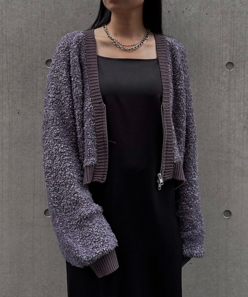 トレンド感を纏う、ボリュームシルエットカーディガン 【Point/Styling】 秋冬らしいボリューム感が可愛い、テープヤーン素材を使用したカーディガン。 深めのVネックと程よいショート丈が立体感を生みつつ、すっきりとした大人な印象を演出します。 ショート丈ながら広めの身幅でリラックス感があり、程よい抜け感のあるシルエットに。 襟元・裾・袖口に施した微配色の太めリブが、全体を引き締めるアクセントになっています。 ウールを使用していないためチクチク感がなく、初秋から秋冬ムードを先取りできる一枚です。 【Styling】 ・存在感のあるトップスなので、シンプルなボトムとの合わせが好相性 ・前を閉じてトップスとして、開けてカーディガンとして使える2way仕様。 ・女性らしく着こなすなら、タイトスカートがおすすめ ・クールに仕上げたい日は、ナイロンパンツやトラックパンツなどワイドシルエットと合わせて ・シンプルなワンピースの上にレイヤードするだけでも、着映えスタイルが完成 ---------------------------------------------------- 【Detail】 ・ウール不使用でチクチク感のない糸を使用 ・配色は近いトーンでまとめ、コーディネートに取り入れやすいデザイン 透け感/あり 光沢感/なし 伸縮性/あり 厚 み/薄い ---------------------------------------------------- ※撮影場所により、実際の色味と若干異なる場合がございます。 またパソコン・スマートフォンなどの環境により、若干製品と画像のカラーが異なる場合もございます。予めご了承ください。 ※商品画像はサンプルのため、色味やサイズ等の仕様に変更がある場合がございますので、予めご了承ください。 ---------------------------------------------------- 【お買い物を楽しんで頂く為に】 ■商品のお気に入り登録 お気に入りの登録をして頂きますと 完売カラーの再入荷通知や、ラスト1点の通知を受け取ることができます。 ■ブランドのお気に入り登録 新商品の発売や再入荷、タイムセールやクーポン発行のお知らせなど &g'aimeがお届けするお得な情報を受け取ることができます。