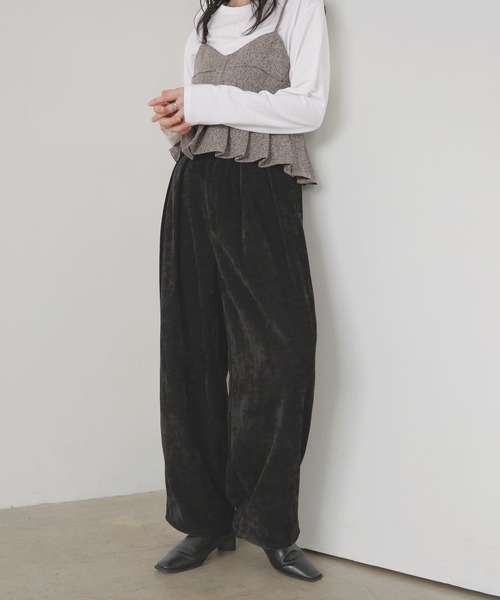 やや光沢感のあるベロア素材がシーズンムードを高めるタック入りスラックスパンツ ウエストのタックが立体感のあるシルエットを生み、身体ラインを自然にカバーしてくれます。 柔らかいベロア素材ながら綺麗なストレートシルエットをキープしてくれて、リラクシーな履き心地を実現。 程よく落ち感のあるサージ生地が美しいドレープを生み、柔らかな女性らしい雰囲気演出します◎ ウエストは後ろゴム仕様でラクちん! イージーなのに、きれいめにもカジュアルにも振れる万能アイテムです。 ボディラインを拾わないワイドパンツで動きやすく、デイリー使いにぴったりな一本。 やや光沢がありしっかり感と柔らかさを兼ね備えたベロア生地を採用。 ミニマルなデザインながらもさりげない上品な光沢が大人の洗練された印象に◎ 着こなし次第でオンオフ問わず幅広く使えるワードローブに取り入れたいスラックです。 ------------ 裏地 なし 透け感 なし 伸縮性 なし 光沢 ややあり ポケット あり 洗濯方法 手洗い可 ------------ 【スタイリング】 ゆるっとしたシルエットのパンツのため、コンパクトな丈感のトップスがおすすめ◎ ざっくりとしたニットとも相性が良く、秋冬の季節感を引き立てます。 スウェットやロンT合わせで抜け感のある大人カジュアルが完成。 シャツやブラウスとの相性も抜群で、インでもアウトでもバランスよくきれいめにまとまります。 足元はヒールでより女性らしく仕上げるのも、スニーカーで抜け感を出すのもおすすめ! ※お使いのモニター設定、お部屋の照明等により 実際の商品と色味が異なる場合がございます。 物撮り写真はできる限り実物の色に近づけるようにしておりますので、 色に関しては商品の物撮り写真をご参考ください。 ▼もっとお買い物を楽しんで頂く為に▼ 〈商品のお気に入り登録〉 お気に入りの登録をして頂きますと セールの通知・ラスト1点になった時の通知や、再入荷通知を受けることができます。 〈ブランドのお気に入り登録〉 新商品の発売や再入荷、タイムセールやクーポン発行のお知らせなど LIANがお届けするお得な情報を受け取ることができます。