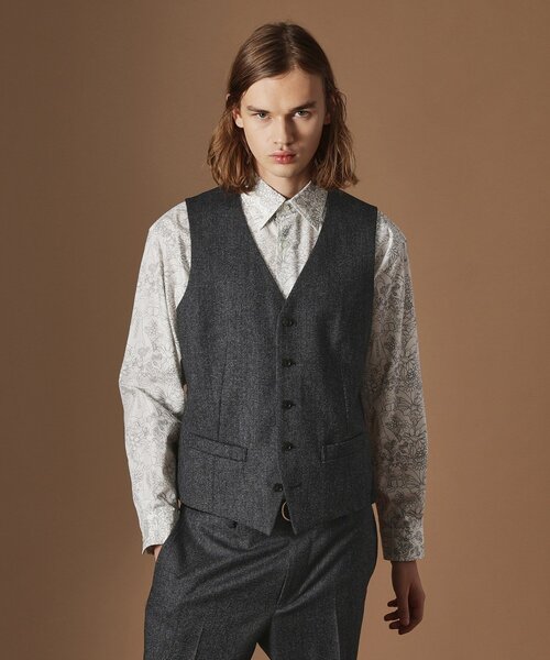 【デザインポイント】 ・シルエットにこだわったベーシックベスト ・秋冬シーズンにピッタリな微起毛ウール混素材 ・オンにもオフにも着用出来るベーシックベスト ベーシックなデザイン、シルエットでセットアップはもちろん単品使いもできるアイテムとなっています。 シックで落ち着いた色合いに対して遊びの利いた柄シャツを裏地として採用し、オンもオフも使いやすく、幅広いシーンで活躍すること間違いありません。 【素材・特性】 秋冬シーズンにぴったりなピンチェックミルド素材を採用。 ダークなベースカラーに温かみのある白い糸が点描のごとく細かく入ることで、表情と深みを生み出しています。 さらにミルド加工という特殊な加工を施すことで、表面に織り目が見える程度に短い毛羽を立たせ、軽くて暖かく品のある上品感を漂わせています。 毛織物産地の尾州で生産しています。 同素材でジャケット(205-44010)、スラックス(205-74010)も展開。 40ct&525らしい柄シャツを合わせた3ピーススタイルはもちろん、カットソーやニットと合わせたOFFコーデもおすすめです。 【仕様】 ・ポケット数:横×2 ・裏地:総裏仕立て ※照明の関係により、実際よりも色味が違って見える場合があります。また、パソコン・スマートフォンなどの環境により、若干製品と画像のカラーが異なる場合もございます。 モデル情報:身長182cm B83 W67 H91 着用サイズ:03(L) 店舗へのお問い合わせ商品番号:205-44011 ●製品寸法: 01(S):着丈53cm B99cm 肩幅34cm 02(M):着丈55cm B103cm 肩幅35cm 03(L):着丈57cm B107cm 肩幅37cm 04(LL):着丈59cm B111cm 肩幅38cm 備考:
