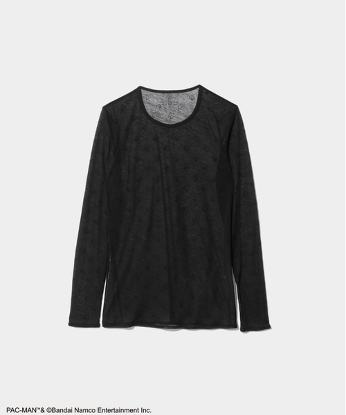 【デザインの特徴】 ・シンプルなクルーネックトップ ・世界的に人気を誇るゲーム”パックマン”とのコラボレーションアイテム ・“C”の文字は、『パックマン』オリジナルの「パックフォント」を使用 ・上品な光沢と立体感が綺麗なフロッキープリント ・透け感を活かしたレイヤードを楽しめるデザイン ・体にフィットするシルエット ・長袖 ・ヒップ丈 【素材のこだわり】 ・細番手の綿糸を繊細に編んだシースルー天竺 ・ストッキングの様な伸縮性が特徴 ・柔らかい風合い ・清涼感のあるドライな肌触り