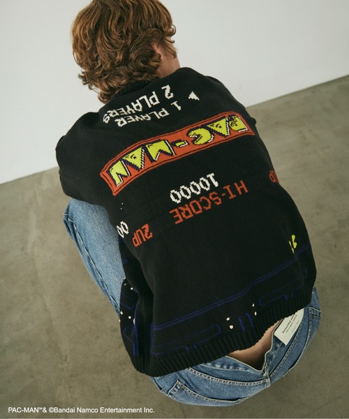 【デザインの特徴】・ゆったりとしたボックスシルエットのプルオーバー・世界的に人気を誇るゲーム”パックマン”とのコラボレーションアイテム・パックマンのゲーム画面を前後で回り込ませることでバグ画面と上下逆の発送を表現・インターシャ柄とジャカード柄を複雑に組み合わせているのが特徴・刺しゅうで表現したキャラクターがアクセント【素材のこだわり】・ベースと柄には綿に近い状態の綿糸を杢糸状態に組んだリリヤーン糸を使用・撚りのない綿糸は光沢感を残しつつも、しっとりと柔らかな質感を持ち合せている・ポリエステルと混紡することで軽量感とダレにくさが特徴・綿でありながらも温かみのある風合いが特徴