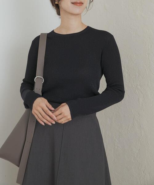 さり気ないラメが華やかさを添える、リブプルオーバーニット さり気ないラメ糸を編み込んだリブプルオーバーニットは、シンプルながらも程よい華やかさを演出してくれる秋冬のマストアイテム。 程よいフィット感のあるサイジングが身体のラインを美しく見せつつ、ストレスのない快適な着心地を実現。 素材にはビスコースナイロンを使用しており、柔らかくしなやかな風合いが魅力です。 一枚で着ればラメのきらめきがコーディネートの主役になり、ジャケットやカーディガンのインナーとして取り入れれば、さり気なく華やぎを添える存在感を発揮。 シンプルな中に輝きを仕込んだデザインは、カジュアルからきれいめまで幅広いスタイリングにマッチし、コーディネートの幅を広げてくれます。 オンオフ問わず活躍する一着は、秋冬のワードローブに加えておきたい頼れるプルオーバーニットです。 【2025 Autumn/Winter】【25AW】 総重量 : 約220g ※商品画像は、光の当たり具合やパソコンなどの閲覧環境により、実際の色味と異なって見える場合がございます。予めご了承ください。 ※商品の色味の目安は、商品単体の画像をご参照ください。 ▼お気に入り登録のおすすめ▼ お気に入り登録された商品は、マイページにて現在の価格情報や在庫状況の確認が可能です。 お買い物リストの管理にぜひご利用ください。 素材感 透け感 : ややあり 伸縮性 : あり 裏地 : なし 光沢 : なし ポケット : なし M