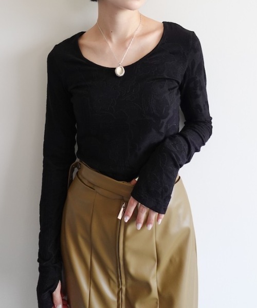 体に優しく沿う、ストレスフリーな着心地リーフ柄が浮かび上がるロングスリーブトップス。伸縮性に優れた滑らかな生地を使用。素肌に沿うコンパクトなサイズ感で、一枚ではもちろん、キャミソールやワンピースとのレイヤードを楽しんだり、ニットの中に忍ばせて袖や胸元からちらりと見せたスタイリングもおすすめ。軽やかでニュアンスのあるレイヤードスタイルを演出します。◼︎Point・程よく開いたラウンドネック。前後ろどちらでも着用可能。・ストレスフリーな伸縮性。・サムホールつき。・体に沿うコンパクトデザイン。スタッフレビュースタッフA身長:160cm普段のサイズ:Mサイズ骨格:ナチュラル肌に優しく沿う一着。前後ろどちらでも着られます。もちっとした柔らかく質感で長時間着ていてもリラックスして着れました。スタッフA身長:158cm普段のサイズ:Sサイズ骨格:ストレート袖丈は指の第二関節くらいの長さで、サムホールがついています。身幅など、全体的に体のラインを拾うタイトなサイズ感。伸縮性がある為着脱もしやすく、着心地がとても良かったです。スタッフB身長:153cm普段のサイズ:Sサイズタイトめですが、やわらかい生地感のトップス。シンプルすぎないデザインがお気に入りです。--------------------------------透け感 :Ivoryあり、他なし裏地 :なし伸縮性 :あり光沢感 :なしポケット:なし--------------------------------※画像はサンプルを使用しているため実際にお届けする商品と仕様やサイズが異なる場合がございます。※照明の関係により実際よりも色味が違って見える場合があります。またパソコン・スマートフォンなどの環境により、若干製品と画像のカラーが異なる場合もございます。※実際のお色味は商品単品画像をご確認くださいませ。※商品によってはシワが付きやすく、畳み皺や折り皺が強く出る場合がございます。 洗濯表示や品質をご確認の上、アイロンまたはスチームアイロンをかけていただくことを推奨します。ブランド品番:01-TP153-25-03【sahara/サハラ】遠い記憶、遥か異国の土地、文化、伝統。をコンセプトとし、現代に生きる女性に、ノスタルジックなリアルクローズを提案いたします。●商品のお気に入り登録再入荷、残り1点、セールなどの通知を受け取ることが出来ます。●ブランドのお気に入り登録新商品や再入荷、ショップのおすすめトピックスなど、いち早くブランドのお得な情報を受け取ることができます。
