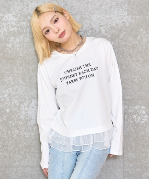 女の子らしいペプラムデザインに心惹かれる長袖Tシャツです。シアー感のあるチュールを重ねて、華やかな雰囲気に仕上げました。普段使いしやすいベーシックなカラーリングなのもポイント。ウエストアウトしてもおしゃれに決まるアイテムです。刺しゅうの裏に「あて布」はございません。【透け感】透けない【生地の厚さ】普通【伸縮性】あり【裏地】なし【ポケット】なし【アジャスター】なし