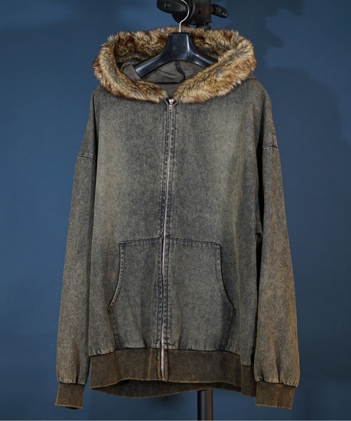 トレンド感のある加工デニムパーカーのフードにファーがデザインされたアイテム。ウォッシュ加工を施したデニム素材なので着こむほどに味わいが増し、古着のように経年変化も楽しめる1着です。 フェイクファーの色味もy2Kで人気のあるデザインをイメージして作成いたしました。 ファーがあることによってフード周りにもボリュームが出るため顔周りが華やかに演出できます。 デニムは薄すぎず厚すぎないちょうどいい厚さなのでごわつかず羽織りやすいのが魅力。 【カラー展開】 カラー展開は加工感のあるブルーデニム、加工感のあるブラックデニム、そしてそのブラック加工ブラックデニムにオーバーダイ加工を施したヴィンテージブラックの3タイプをご用意いたしました。 ボディはもちろん、リブにも加工が施されていますので自然な仕上がりになっています。 カンガルーポケットがついたパーカータイプですのでどのようなコーディネートにも合わせやすいです。 【サイズ感】 サイズ感はリラックス間のあるややゆとりのあるオーバーサイズのシルエットで、ゆるっとラフにキマるトレンド感のあるシルエット。 ゆったりとしたシルエットながら、肩の自然な落ち感と袖にボリュームを持たせたことで洗練されたフォルムに仕上げました。 ファーブルゾンとして使用できるようにインナーにもしっかりニットを着れるようなサイズ感に仕上がっています。 ショルダーバッグやナップサックなどのカジュアルなバッグやどんな系統にも合わせやすいです。 ベースは定番なパーカーデザインなので男女問わずユニセックスに着用していただけるアイテムとなっています◎ デニム素材なのでパーカーとしてはもちろん、デニムジャケットやブルゾン感覚の着用ができます。 シンプルでミニマルなデザインなのでカジュアルからキレイめまで幅広いスタイルに合わせられる万能アウターとして使えます。 春や秋口にはロンTやTシャツなどと合わせたスタイルや 寒くなってきた際にはニットセーターやスウェットなどの秋服にさらっと着用すればビンテージ感も相まってトレンドライクな着こなしが可能です。 ボトムスはスラックスパンツやフレアパンツなどのきれいめアイテムの他、 カーゴパンツやスウェットパンツなどのストリートアイテムでもいいですし ダメージデニムパンツなどと合わせることで古着MIXなコーデも可能です。 ■attention 1)摩擦(特に湿った状態での摩擦)や雨・汗などで、他の衣料やバッグ等の周りのものに色移りすることがありますのでご注意ください。 例)車のシート、Tシャツ、バッグ、ベルト、シューズ、靴下等 2)色落ちしますので、他の物と一緒に洗わないでください。 3)洗濯の際は洗濯ネットをご使用し、裏返しにして洗って下さい 4)つけ置き洗い、濡れたままの放置は避け、洗濯後は形を整えて直ちに陰干ししてください。 5)直射日光等により退色・変色する事がありますので、お取り扱いにはご注意ください。 6)商品の特性上、色味や染まり具合が若干異なる場合がございます。商品画像はあくまでイメージですので、予めご了承ください。