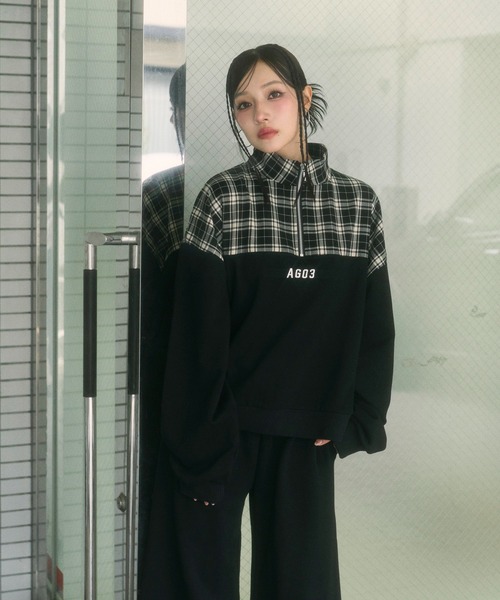 チェックとスウェット生地のドッキングスウェット。ハーフジップなのでネックを立てても折り返しても着ることができます。 UNISEX 2WAYチェックロゴスウェットパンツ(AG253PT0903)とセットアップでご着用いただけます。