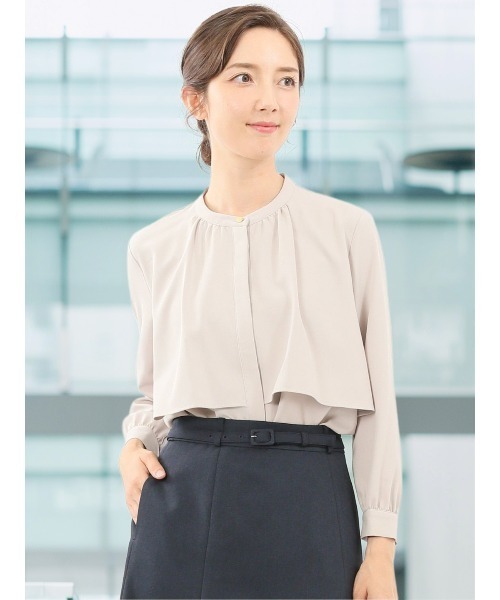 ■素材特徴 ポリエステルにポリウレタンを混紡した綺麗目なジョーゼットを使用しています。優しい肌触りとサラリとした着心地が魅力です。ストレッチ、UVカット、シワになりにくい、マシンウォッシャブル等、さまざまな機能を兼ね備えています。 ■機能 【ストレッチ】伸縮性に優れ動きやすく、長時間の着用もストレスフリー。 【マシンウォッシャブル】洗濯機で洗えます。(要ネット・標準水流) 【イージーケア】洗濯後もシワが入りにくく、お手入れも簡単です。 【UVカット】紫外線を通しにくい生地を使用することでお肌を守ります。 ■デザイン お顔まわりを華やかに演出してくれる、前開き仕様の長袖ブラウスです。前身頃のレイヤード風デザイン、すっきりとしたバンドカラー、ボタンを隠した比翼仕立て、袖口のカフスとゴールドのボタンがポイント。キチンと感のあるクリーンなルックスなのでオンオフ兼用で大活躍してくれます。 ■シルエット 幅広い年代の方に着ていただけるベーシックなシルエットです。裾部分はストレートカットです。 ■コーディネート 一枚で着映えしますが、綺麗目スーツやジャケットのインナー使いにもおすすめです。かっちりとしたスーツスタイルを、上品で洗練された印象に仕上げてくれます。プライベート、オフィス、セミフォーマル等、幅広いシーンに着回し可能です。 フィット感:標準 シーズン:秋冬 展開カラー:アイボリー・ライトグレー・グレー・ワイン *アテンションタグ・洗濯ネームを御確認の上、着用又は取り扱い下さい。 *光の当たる場所や高温多湿になる場所での保管は避けて下さい。 *使用の有無に関わらず、経年劣化は進行いたしますのでご了承下さい。 *生地の裁断・縫製方法により、写真と同様の柄が出ない場合がございます。 *閲覧デバイス・環境により質感・色味に誤差が生じる場合がございます。予めご了承くださいませ。* ZOZOTOWN お買い物ガイド・商品のお気に入り登録 ♡をクリックしましょう!完売カラーの再入荷通知や、ラスト1点の通知、セールの通知をお知らせします。・ブランドのお気に入り登録 新商品や再入荷など、いち早くお得な情報を受け取ることができます。・最短で翌日お届け 商品をカートに入れた後、注文内容の確認ページで「即日配送」を選択していただければ、最短でご注文した翌日にお届け致します。 (ZOZOTOWNお買いものガイドをご参照ください)