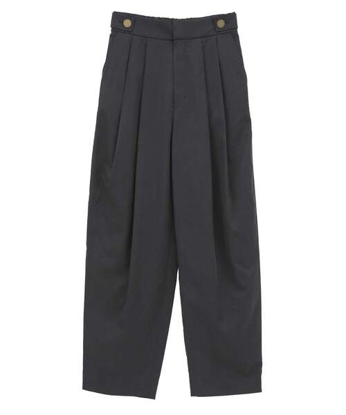 2タックでウエスト周りにゆとりを出し、裾にかけてややテーパードのバレルパンツ。 綿混のナチュラル感とサテンを微起毛した程よい光沢感が特徴の素材です。 環境保全の基準を満たしたサステナビリティ素材で手洗い可能となっております。 ハイウエストでサイドのメタルボタン使いがアクセントとなっており、後ろゴムで履き心地も抜群です。 トップスをインしてすっきり着こなすのがお勧めです。 ※サンプル撮影のため実際の仕様と異なる場合がございます。 予めご了承ください。 ■透け感 なし ■伸縮性 なし ■光沢感 なし ■裏地 なし ■生地の厚さ 普通