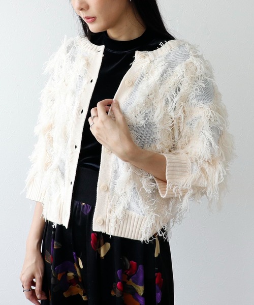 動きのあるフリンジデザインがポイントのカーディガン 羽織だけではなく、トップスとしてもお使いいただける前後2WAY仕様。 馴染みやすい程良い着丈が パンツにもスカートにも合わせやすく 一枚あると大人のカジュアルコーデに重宝します。 -------------------------------------- 透け感:あり 裏地:なし 伸縮性:なし ケア方法:ドライクリーニング ※お洗濯の際は洗濯表示を必ずご確認ください。 --------------------------------------