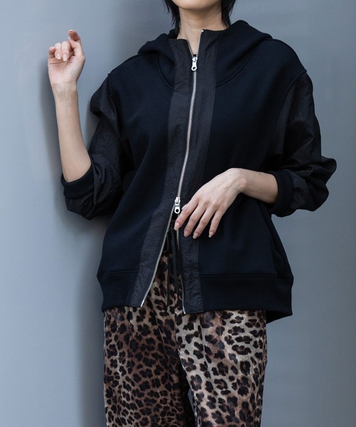 □ 2025 AUTUMN & WINTER COLLECTION □ ◆カジュアルな裏毛としなやかなナイロン生地をドッキングさせたデザインパーカー◆<MATERIAL>カットソー素材:コットンをベースにレーヨンの柔らかさとウールの膨らみを加えたオリジナル30/7番のベーシックな肉感の裏毛素材。タオルの様にパイル状に編むことで空気を含ませ、柔らかな膨らみ感をもたせています。ほどよいハリもあるのでシルエットがきれいに出ます。天然繊維ならではの肌触りの良さでストレスフリーな着心地と、カジュアルに使い易い素材感が魅力です。日本で染色加工をしています。別布:タテ糸にセミダル糸のモノフィラ、ヨコ糸にブライト糸のウーリー糸を使用し、光沢感とヴィンテージのような凸凹とした表面感が特徴です。柔らかさもありつつ適度なハリ感があり、肌触りのよさもポイントです。<DESIGN>フードのボリューム感で暖かみを表現したコットン裏毛のジップフーディーです。フードの衿高と後身頃ボリュームを持たせた女性らしい一枚。袖口と裾廻りはリブ切り替え、前立てと袖部分に表面感のある薄手のナイロンを使用したドッキングデザインが印象的。フロントはベーシックな見た目ですが、バックスタイルに立体的な切り替えを入れ、ころんと丸いシルエットでフォルム感を加えているので、さっと羽織るだけでコーディネートが決まります。袖が薄手のナイロンなので、レイヤードもし易く、羽織りとしても万能ですが、アウターからフードを覗かせたスタイリングもおすすめです。<COLOR>■ブラック:モードで引き締まった印象の深みのあるソリッドブラック■グレイッシュベージュ:ナチュラルで柔らかい雰囲気のグレーとベージュの中間色■ピンク:甘すぎず大人っぽいくすみ感のあるコーラルピンク※光のあたり具合いやパソコンなどのモニター環境によって実際の色味と異なって見える場合がございますので、予めご了承ください。※着用商品はサンプルです。サイズ等の仕様に若干の変更がある場合がございますので、予めご了承ください。※お取扱いについては、商品についております品質表示、アテンションタグにてご確認ください。洗濯:手洗い可.............................≪INFORMATION ≫............................▼商品のお気に入り登録▼『♡』マークを押してお気に入り登録して頂いた商品は、セール開催の通知やクーポン発行などのキャンペーンなど、お得な情報をいち早く受けとる事が出来ますので、ぜひご登録ください。