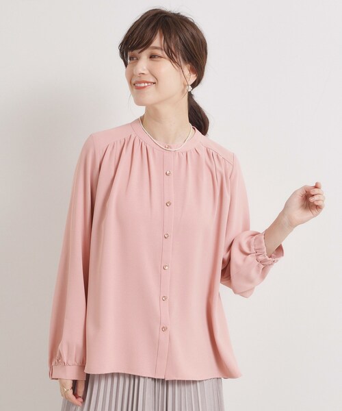 【デザイン】 オフィスシーンにもおすすめのきちんと見えブラウス。 ツヤのあるボタンでさり気なく華やかさを演出。 さらりとした肌触りで、暑さ残る時期でも着やすい素材感のブラウス。 上品なとろみ感があり肌離れ良く、適度なゆとりのあるサイズ感で涼しく着て頂けます。 ベーシックなバンドカラーデザインできちんと感があり、オフィススタイルにもおすすめ。 ツヤ感のあるボタンがさり気なく上品さを演出してくれます。 袖口はゴムが入った仕様になっており、袖をプッシュアップして着られるのでデスクワークや作業時なども助かります♪ 【素材】 さらりとした肌触りと独特のとろみ感が特徴の素材です。 ※照明の関係により、実際よりも色味が違って見える場合があります。また、パソコン・スマートフォンなどの環境により、若干製品と画像のカラーが異なる場合もございます。 ---------------------------------------- ★お気に入り登録がおすすめ★ ▽気になる商品はハートマークをクリック! ・再入荷やセールの通知をお知らせ ・お気に入り一覧からいつでもチェック ▽ブランドのお気に入り登録も! ・新商品やお得な情報をいち早くお知らせ ---------------------------------------- モデル情報:身長166cm B80 W59 H85 着用サイズ:00(フリーサイズ) 店舗へのお問い合わせ商品番号:P93-54502 ●製品寸法: 00(フリーサイズ):着丈61cm B108cm 袖丈58cm 肩幅37cm 備考: