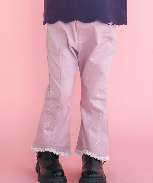 -25AW- カジュアルになりがちなパンツをかわいくアップデートした女の子用ロングパンツ。 ■デザイン サイドにあしらった星やキラキラのグリッタープリントが女の子心をくすぐるキュートなアクセントになっています。 裾にはレースをほどこして細かいところまでカワイイにこだわったデザイン♪ 裾のレースがリボンの模様になっているのもさりげなくカワイイポイント。 通園・通学などのデイリー使いからお出かけまでいっぱい活躍する1着。 合わせやすいデニム素材のネイビー、コーデのポイントになるツイル素材のピンクがかったパープルの2色展開です。 ■素材/機能 どちらの素材も伸縮性のあるストレッチ素材を使用しているのではき心地◎ ウエストはゴム仕様だからひとりでのお着替えもカンタンなのがうれしい。 ※腰・右後ろポケットあり。 ※お洗濯の際は裏返してできるだけ力を加えないようにしてください。 ※プリント、装飾部分は摩擦や揉み作用に弱いのでご注意ください。 ※お洗濯を繰り返すことにより多少の脱落や光沢がなくなることがありますのでご注意ください。 ※生地の特性上、色落ちや色移りする可能性があります。 ※淡色製品とあわせての洗濯・着用に十分ご注意ください。 25秋冬アイテム 【2025年9月のテーマ/World of imagination】 おもちゃ箱から飛び出したみたいな空想世界 カラフルな色づかいノスタルジックな色味を合わせてどこか懐かしさを感じるコレクション 【2025 AUTUMN / WINTER Plaid&Play-秋色チェックと遊ぶ-】 伝統的なチェックにビビットなカラーや子どもらしいモチーフをミックス。 動きやすく着心地のいい素材とシルエットで秋の落ち葉の中や秋風吹く中でも思いっきり遊んで冒険しよう。 【SLAP SLIP(スラップ スリップ)】 ~子どもの欲しいをカタチに~ ヨーロッパのこどものように 子どもらしい今しか着れないナチュラルなかわいさを提案 どこか上品で清楚感漂うフレンチカジュアルは いつものコーディネートをさりげなく格上げ