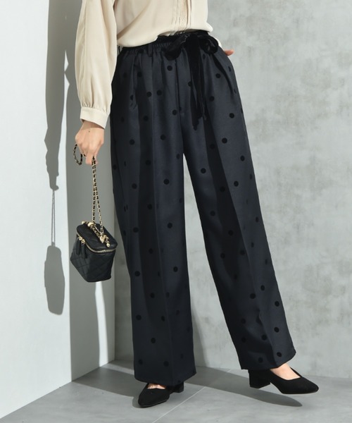 これからのコーデアクセントにパッと目を惹くフロッキードットパンツセンターライン入りの綺麗目ワイドパンツ。パッと目を惹くドット柄でいつものスタイルのアクセントに◎シーズンムードを盛り上げてくれるベロアウエストリボン付きで登場です。*ヒップ周りに適度なゆとりを持たせ、気になる腰回りをスッキリ演出*ウエストははいていて楽ちん!ゴム仕様。*シーン問わず着まわせる万能素材デイリーはもちろん、キレイ目な素材なのでオフィススタイルも良く合います。【取り扱い】ご自宅でイージーケア(手洗い)ができます。INTERPLANET/actuel(インタープラネット/アクチュエル)■conceptいつだって私らしく、私自身のスタイルが決まる。。。時代や年齢に媚びない『らしさ』を纏って生きる女性へ。旬なベーシックと抜け感のあるカジュアルをMIX。そんな大人カジュアルコーデを提案します。■お気に入りの登録についてショップ・ブランドのお気に入り登録でクーポンやタイムセールの通知などお得な情報を受け取ることができます♪また、気になるアイテムのお気に入り登録でセールや再入荷の通知など受け取ることができます。