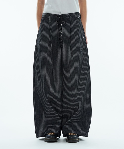 【WISH FOR EVER®/ウィッシュフォーエバー】 『海外ストリート』や『ヴィンテージ』にトレンドを落とし込んだ ユニセックスストリートブランド 新作情報は公式アカウントからチェック! ↓ Instagram【@ wishforever.official】 tiktok 【@ wishforever.official】 ---------------------------------------------- 【 取り扱い方法 】 アテンションタグや洗濯表示を必ずご確認の上、ご使用下さい。 【 洗濯方法 】・手洗いができる ・塩素系及び酸素系漂白剤の使用禁止 ・タンブル乾燥禁止 ・日陰のつり干しがよい ・底面温度120 ℃を限度としてアイロン仕上げができる ・石油系溶剤による弱いドライクリーニングができる ・非常に弱い操作によるウエットクリーニングができる 【 ATTENTION 】 ・移染しやすいので他の物と分けて洗って下さい。 ・洗濯ネットを使用して下さい。 ・長時間濡れたままにしておくと、色が落ちる恐れがあります。洗濯後は形を整えて直ぐに干して下さい。 ・アイロン時はあて布をして下さい。 ・汗や摩擦(特に湿った状態)により色が移る場合があります。他の衣類との組み合わせにご注意ください。 ・この製品は洗濯で若干縮むことがあります。 ---------------------------------------------- ダブルタックで今年らしいワイドなシルエット。 フロントのレースアップ仕様が目を惹くポイント。 ブラックストライプはデニムで、クラシカルなスタイリングにも。 ---------------------------------------------- ※モデル写真はサンプルにて撮影を行い、ビジュアルイメージの為に画像加工を行っております。お届けする実際の商品と仕様が異なる場合がございますので、商品詳細画像を必ずご確認の上ご購入ください。 ※ご覧のモニター環境や撮影環境により、実物の商品と多少色味が異なって見える場合がございます。 また表示のサイズ感と実物は若干異なる場合もございますので、予めご了承ください。 ※サイトに表示されているカラー名と実際のお届け商品に記載されているカラー名が異なる場合がございます。 ----------------------------------------------- 【 SHOPPING 】 ▼商品のお気に入り登録をクリック 再入荷やラスト1点、セール等の通知を受け取ることが出来ます。 ▼ブランド (WISH FOR EVER®) のお気に入り登録 最新のブランド情報を受け取ることが出来ます。