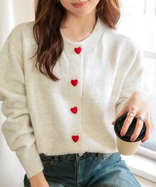 フロントのハートボタンがアクセントになった、大人可愛いニットカーディガン。ゆとりのあるぽわんとしたシルエットと柔らかな素材感が、可愛らしさの中に落ち着きをプラスします。 甘さをさりげなく取り入れつつも、きれいめなスタイリングにもマッチ。 羽織りとしてはもちろん、ボタンを留めてプルオーバー風に着ても楽しめる万能アイテムです。 【素材・サイズ感】 程よいゆとりを残したコンパクトなシルエットで、華奢見えを叶える一枚。 肩落ちのデザインが自然な抜け感を演出し、ふんわりとした長めの袖が可愛らしさを添えます。 腰まわりをカバーする着丈で、パンツにもスカートにも合わせやすいバランス。 袖のふんわり感とリブのメリハリが、ほんのり甘さを加えた大人可愛いスタイルを仕上げます。 【STAFFコメント】 ハートモチーフのボタンがおとなかわいい長袖ニットカーデ。 バイカラーのハート釦がフェミニンなアクセントに♡ アウターとしてはもちろん、ボタンを閉めてニットトップス風でも着用できて2wayの着こなしが楽しめます。 ゆったりシルエットなので体型カバー力も◎ ガーリーな秋冬大人カジュアルスタイルにぴったりなロングスリーブニットです。 《KOBE LETTUCE ー神戸レタスー》 プチプラレディースファッションからコスメまで、トレンドアイテムを豊富に取り揃えております。 毎シーズン発売されるインフルエンサーとのコラボ商品はSNSでも話題に。