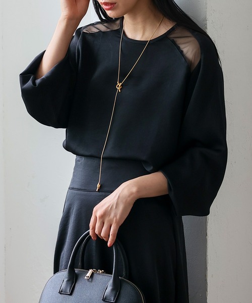 【デザイン】 サテン×チュール 異素材切替ブラウス なめらかで肌触りの良いサテン素材を使用した、上品な印象のトップス。 肩部分をチュール切り替えにしたことで、ほどよい肌見せが叶います。 袖口はゴム仕様で、ふんわりとしたバルーンシルエットを楽しめるデザイン。 袖をまくると自然なボリューム感が生まれ、こなれた雰囲気のスタイリングに◎ デイリー使いはもちろん、食事会やオケージョンシーンにもぴったり。 きれいめパンツやタイトスカートと合わせれば、オフィスや通勤スタイルに。 デニムに合わせれば、抜け感のある大人カジュアルコーデが完成します。 アクセサリーやヒールをプラスすることで、パーティーやオケージョンにも活躍する万能アイテムです。 【サイズ等】 サイズ:FREE 総丈:前61cm/後71cm 身幅:58cm 裄丈:78cm 袖口幅:11cm 重量:155g 素材:ポリエステル100% …………………… 伸縮性:なし 裏地:なし 透け感:【チュール部分】あり/【サテン部分】ホワイト若干あり 生地の厚さ:薄い ポケット:なし …………………… 【お取り扱い上の御注意】 繊維および染料の性質上、汗や水で濡れますと色落ちすることがあります。 長時間の水などの浸漬や浸け置き洗いは、縮みや色落ちの原因となりますのでお避けください。 洗濯の際は他の物と分けて洗ってください。 洗濯後は直ちに軽く脱水し形を整えすばやく干してください。 家庭洗濯時のタンブル乾燥はお避けください。 濡れた状態で他の物との擦れによる色移りにご注意ください。 デリケートな素材を使用していますので摩擦や突起物に気を付けて、引っ掻き傷や穴を作らない様ご注意下さい。 洗濯ネットをご使用下さい。 [カラー] ブラック・ホワイト 着用モデル身長:164cm/着用サイズ:FREE ◆商品のお気に入り登録◆ 完売カラーの再入荷通知や、ラスト1点の通知、 セールの通知も受け取ることができますので、是非ご登録ください。 ◆ブランドのお気に入り登録◆ 新商品や再入荷などの情報を受け取ることができますので、是非ご登録ください。