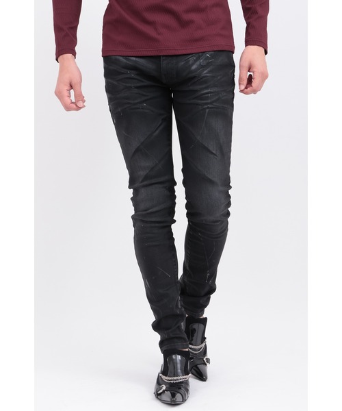 [DESIGN] 多種コーティングで仕上げたスキニーデニム。 ヴィンテージ調にベース加工を施した後に、同色系のコーティングとクリアコーティングをドリッピングでちらした一本。 後ろヨーク部分は、スマートフォンを入れられる隠しポケット仕様になっています。フロントはZIP仕様。 縫製から加工まで、すべてを国内で行ったオールメイドインジャパンの1着です。 [TEXTILE] ストレッチ性のある12.5OZ(オンス)のハイブリッドデニム地を使用。 通常のデニムより強い伸縮性があり、タイトなシルエットでもストレスなく着用できます。 日本が誇る岡山産地のデニム地です。